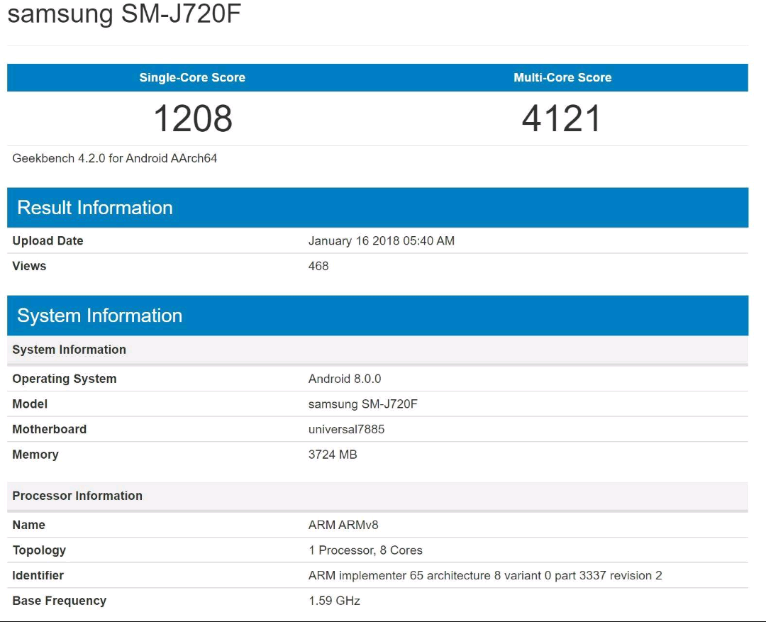 The device with model number SM-J720F was seen running Android Oreo 8.0.Lets check out the completed specifications as in screenshot below